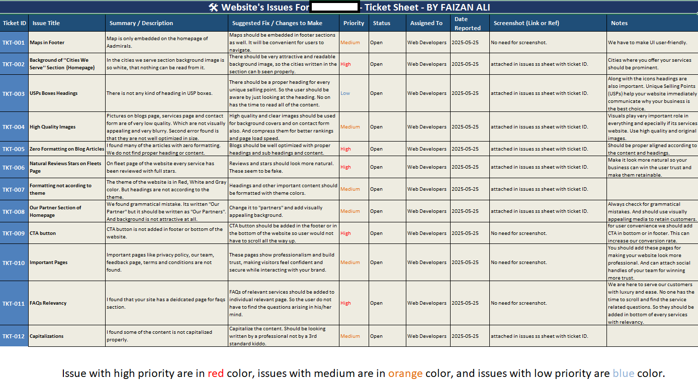 - Priority-Based Categorization: I segmented the issues into High, Medium, and Low priority based on their impact on business goals, SEO, and user experience.